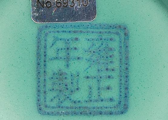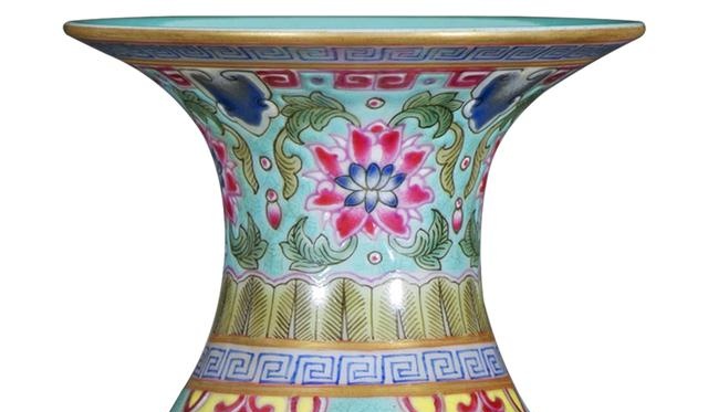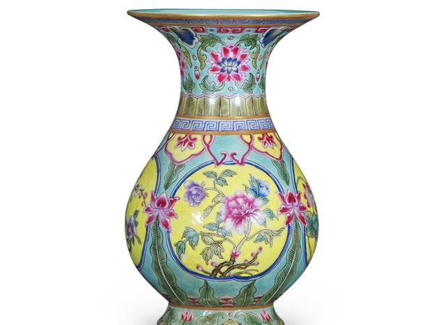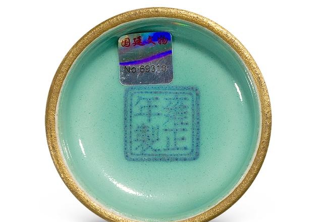 此瓶造型撇口,束颈,鼓腹,高圈足,微撇,圈足涂金,内施松绿釉蓝料双框书“雍正年制”四字双行楷书款;全器呈现出色彩斑驳、精巧玲珑之态。纵使其器形、色调、折枝花卉均常见于雍正御瓷,但此造型与画工相媲美者寥寥无几,足见此瓶之珍。