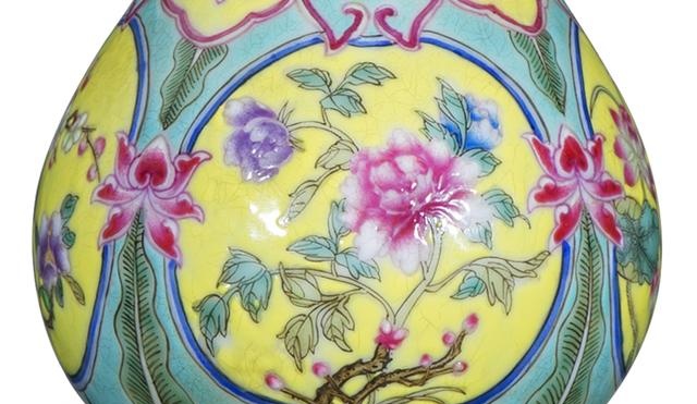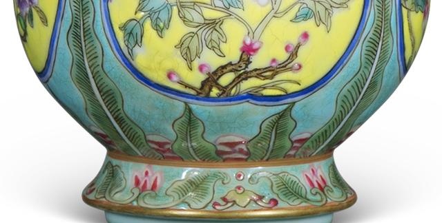 瓶身通体施绿地,装饰如意宝相花,瓶身四面圆形黄底开光,分别绘四季花卉;春有三色牡丹,夏有绿叶红花,秋有金菊数盏,冬则梅花朵朵。此瓶有“万寿延年,报喜呈祥”之寓意,全器雍容华贵,端庄中流露喜庆,为雍正朝之珍品也。