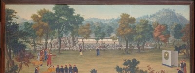 画面上无作者署款,据考证当出自法兰西传教士画家王致诚的手笔(参见《故宫博物院院刊》1991年第1期,杨伯达《乾隆射箭油画屏述考》一文)。此图完成后曾挂在避暑山庄如意洲双松书屋内。