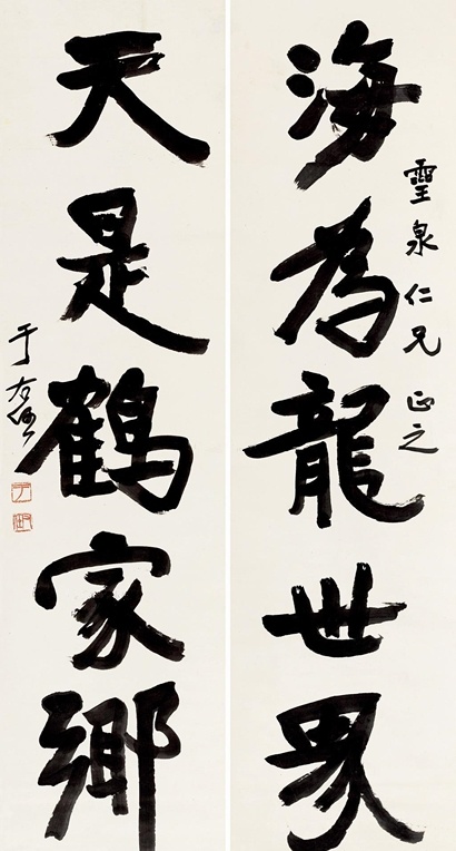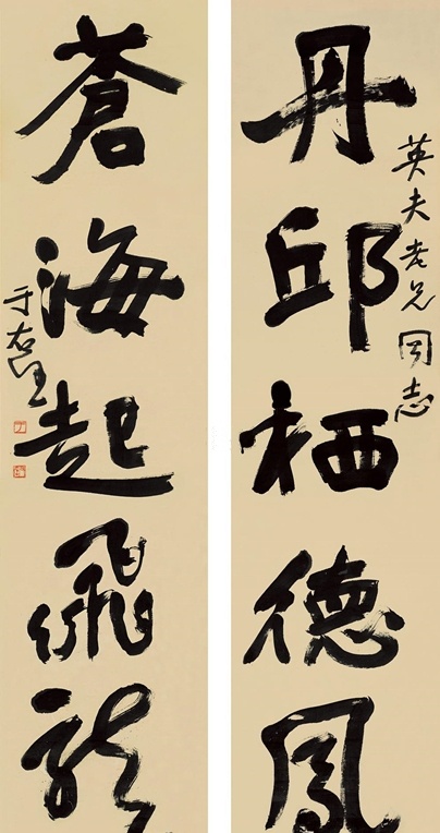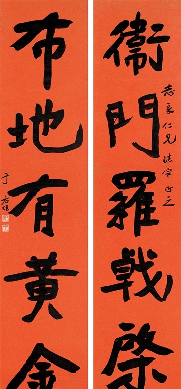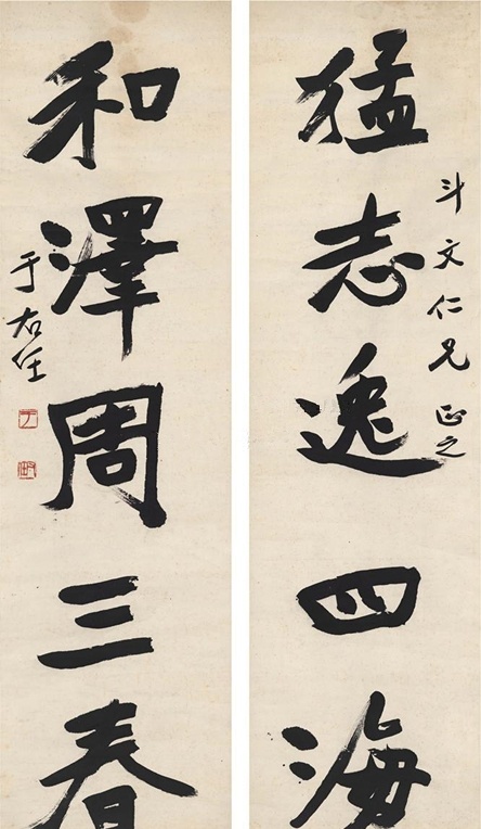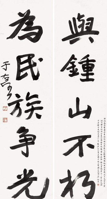 于右任老先生的书法历程主要分为两个时期。第一个时期是以魏碑为基础,写出具有强烈个性的行、楷书作品时期。于老先生收集大量魏碑是从1920年开始,一方面是为了研究和临摹魏碑字体,另一方面也是出于对这些魏碑遗产的保护,尤其是到抗日战争时期,更是达到了一个文化瑰宝抢救的局面。魏碑作品,具有气势磅礴,古朴浑厚的书风,在它中宫谨守的基础上,早期,于老先生写出了更为舒展方劲的楷书作品。这类作品普遍体势偏方,顺笔入纸故而收束自然,用笔具有魏碑字体的工谨又不刻意追求凸显棱角的刀意,是难得的佳作,只可惜如今传世非常稀少。在楷书作品过后,于老先生的行书又大有所成,这得益于老先生自己将行书的笔法与魏碑字貌笔势联系并融汇一体而生发的。这种两者意趣的结合使得于老先生的行书作品既有魏碑刚厚的风骨,又不失晋唐行书飘逸的走势,在布局上更是奇绝,险中求稳,稳中求动,收放自如。行书作品时期是于右任老先生对联作品的创作巅峰,相关佳作多见其书法著作《右任墨缘》。
