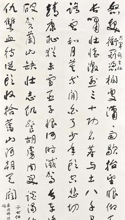 于右任老先生的书法创作的第二个时期是创立标准草书时期。于右任老先生认为书写者对于历代草书所呈现出来的章法和系统规律的认知是很有必要的,同时即使是个性极强的草书也应该具备“易识”、“易写”“准确”、“美丽”的原则,所以他不仅自己研习创造了具有魏碑风骨的“碑草”,更是大力提倡并亲办了标准草书的相关文字发行。这在近现代书法史上是一座不可磨灭的丰碑。标准草书的创立,让历代草书精品的承接从抽象的个人任意发挥转变为有系统规律可循的代表符号的联通,是后人自我创造的章法构架和走笔基础。