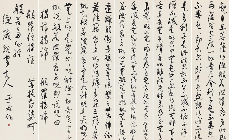 《草书心经》六屏立轴,水墨纸本,成交价格RMB1,840,000。132×33cm×6,似本幅以六屏形式者,则绝不多见。字体草行相间,字形起伏跌宕;用笔方圆兼备,天趣浑然,气象朴茂,顿挫郁勃;线条使转自如,形断意连。通篇行气流畅,有如悦耳的音符,凑出空灵的佛门梵响。在欣赏这堂《心经》六屏时,除体会到于右任标准草书的独特魅力之余,更可虔心静气地感受佛法的澄明心境。