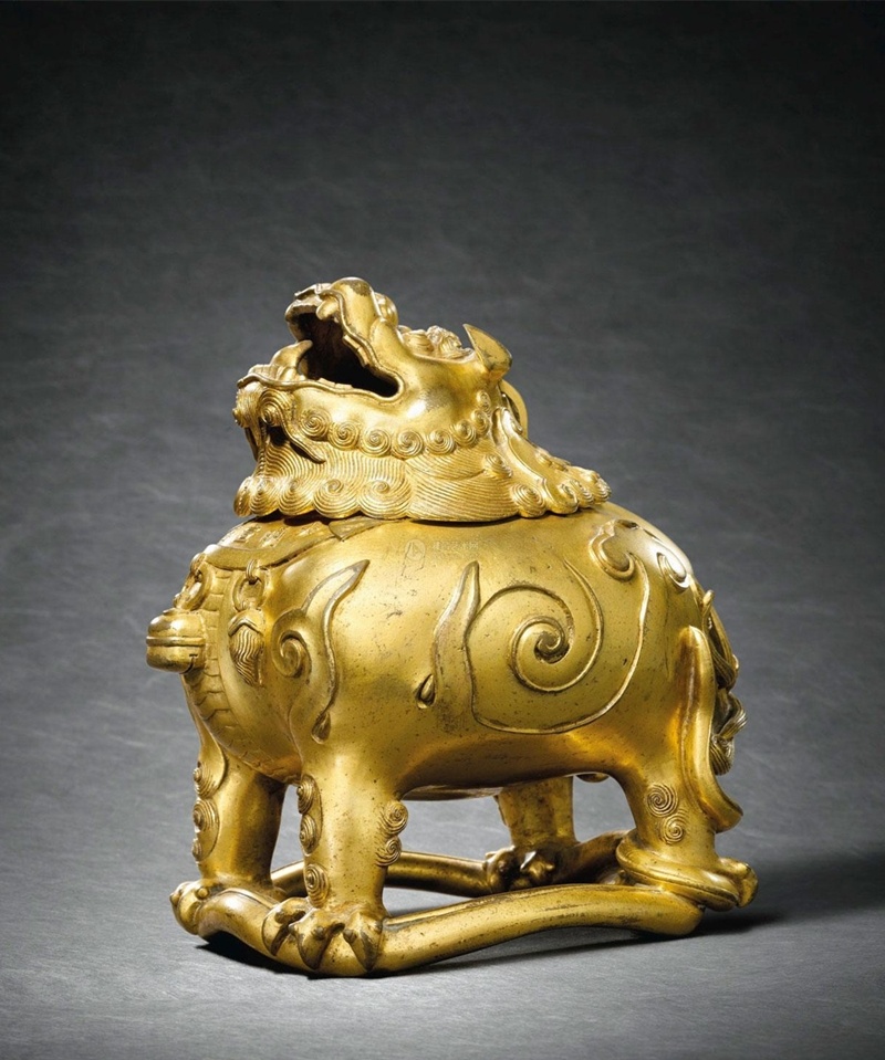 2:明宣德铜鎏金甪端熏炉,尺寸:16厘米,估价:HKD 3,500,000 ~ 4,500,000,成交价: HKD 4,240,000 ,成交时间: 2014-04-08 ,拍卖公司:香港蘇富比拍卖有限公司,拍卖专场:2014年春季拍卖会 。