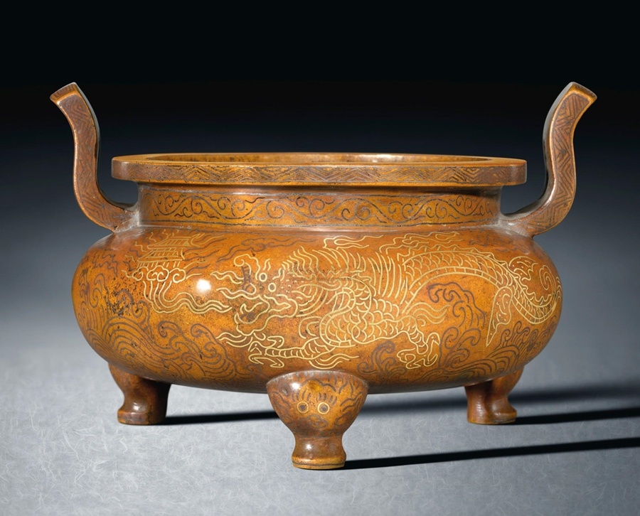 3:明成化铜嵌金银线「水波游龙」图三足双耳炉,尺寸:14.6厘米,估价:HKD 3,500,000 ~ 4,500,000,成交价: HKD 4,220,000 ,成交时间: 2012-04-04 ,拍卖公司:香港蘇富比拍卖有限公司,拍卖专场:2012年春季拍卖会(一)。