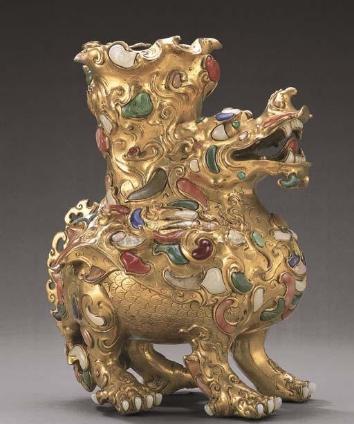 4:清乾隆鎏金铜镶嵌百宝瑞兽香薰,尺寸:高26厘米,估价:HKD 2,500,000 ~ 3,000,000,成交价: HKD 4,152,000 ,成交时间: 2005-11-28 ,拍卖公司:佳士得香港有限公司,拍卖专场:2005秋季拍卖会。