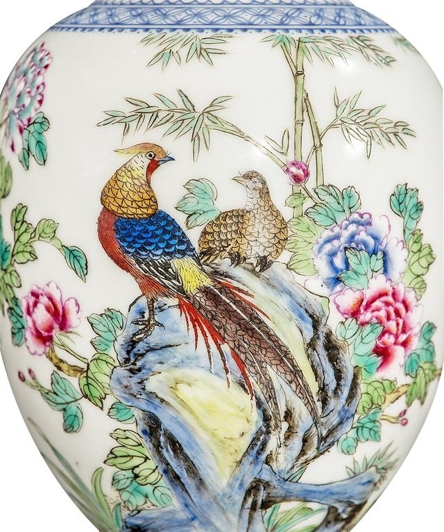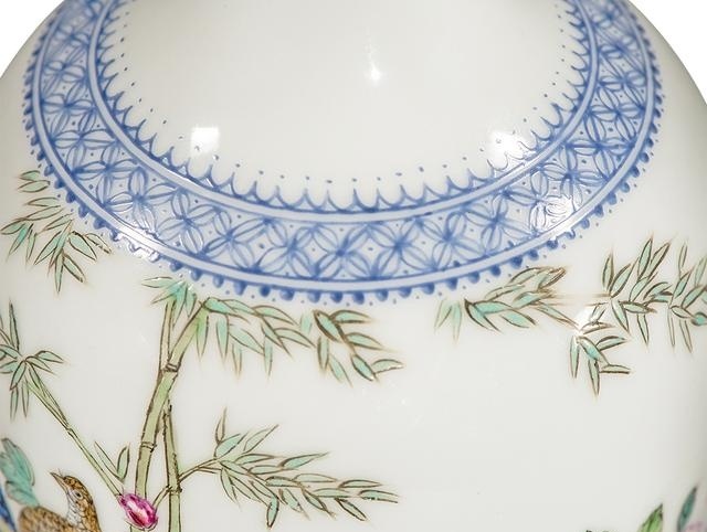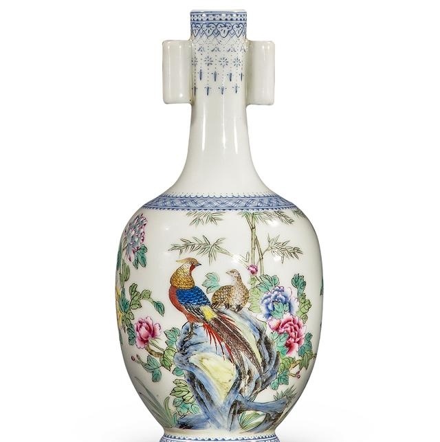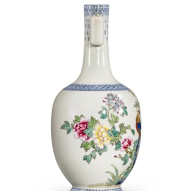 造型更是隽秀尔雅,端庄且雅致。雍正帝为了达到自己极高的审美境界,特令御窑厂烧制此瓶,瓷胎料用上好的高岭土精挑细磨,造型经多次修改而定型,图案纹饰工整别致,绘画中的花卉、鸟禽栩栩如生,活灵活现,其画风比在宣纸上作画更为流畅传神。