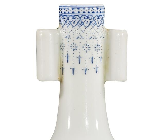 贯耳瓶乃汉族传统器型之一,流行于宋代,因颈部两侧对称帖竖直的管状贯耳而得名。此瓶釉层肥厚,洁白莹亮,玉质感极强,呈现出自然界天然玉石般质感,让开眼界。