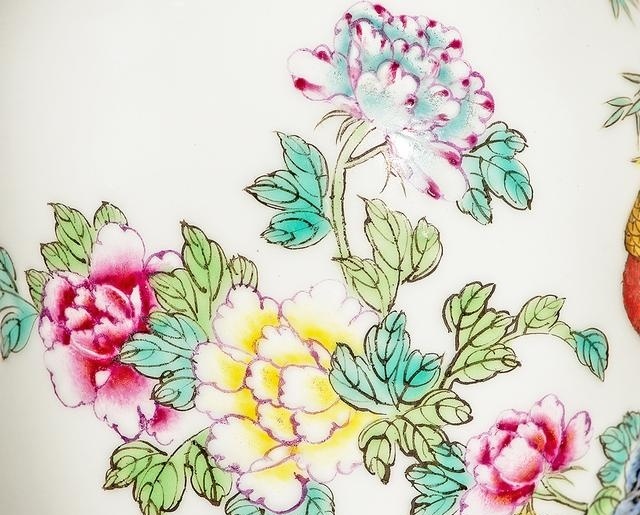 瓶腹绘雉鸡花卉,雉鸡黄翎红腹,圆睛尖喙,雄健的双脚立于奇石之上。旁边的牡丹争奇斗艳,花朵绽放,叶片挺拔舒展,一阵轻风吹来,隐约闻得缕缕花香。给人舒心、爽朗之感。