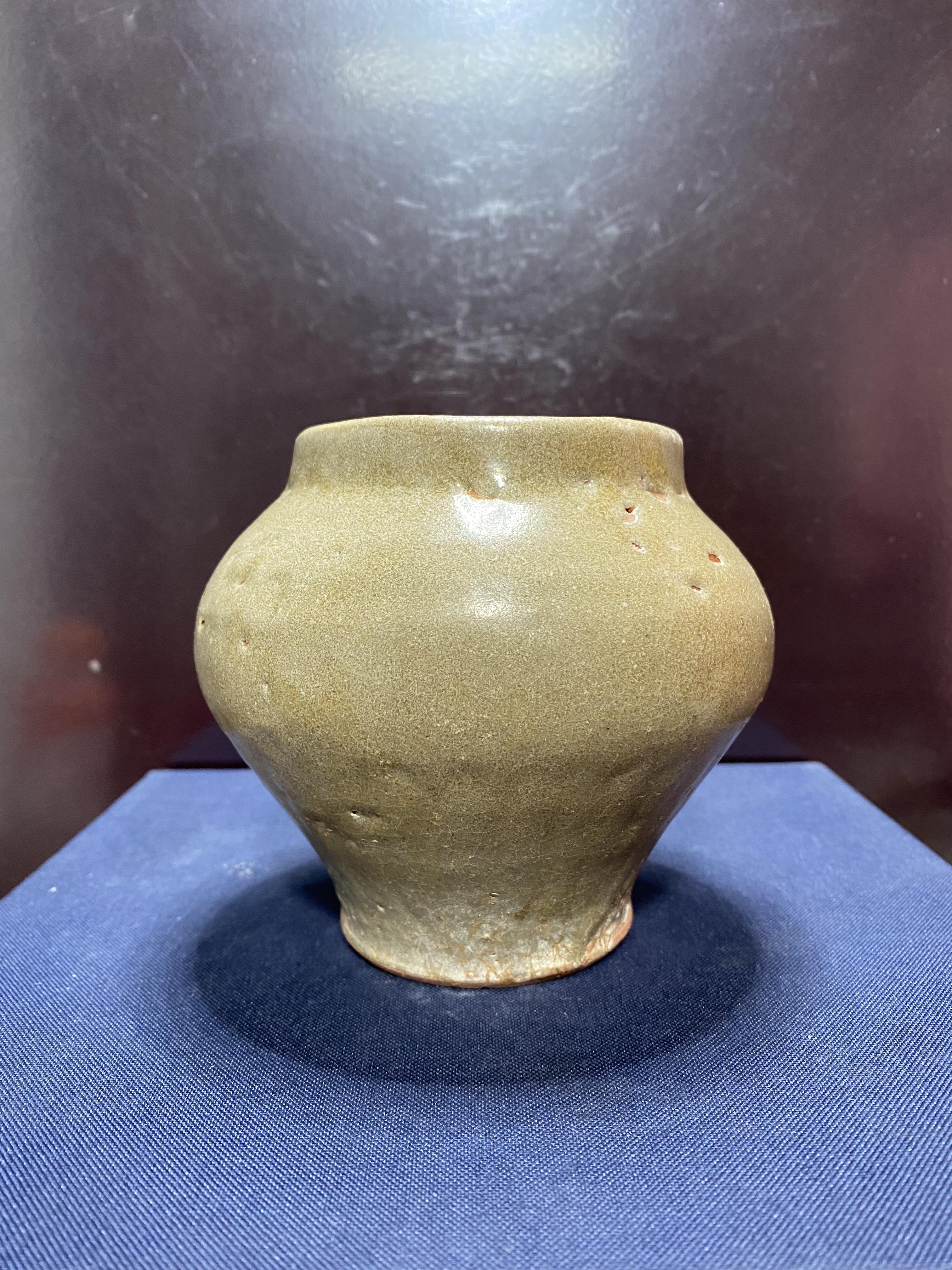 宋,龙泉金村窑仰莲罐。釉水发色不错。底足干老。规格10.5X12,完好。