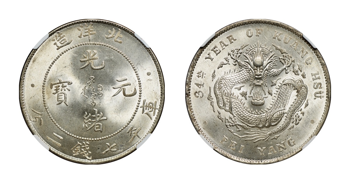 5:北洋造光绪34年七钱二分普通 PCGS MS 64 ,估价: USD 5000 - 7500,成交价格: USD 14400,拍卖公司:SBP,拍卖专场:SBP2020年10月香港#D-机制币地方,成交时间: 2020-10-07 19:00:00。