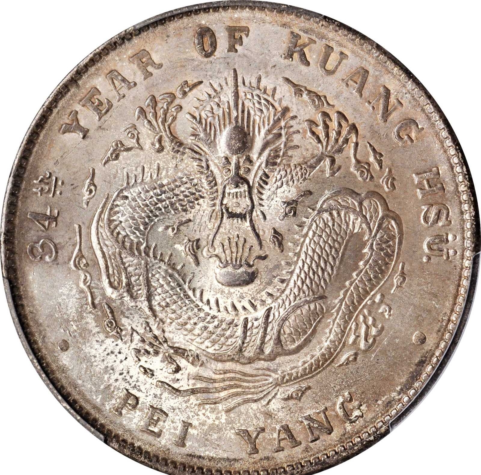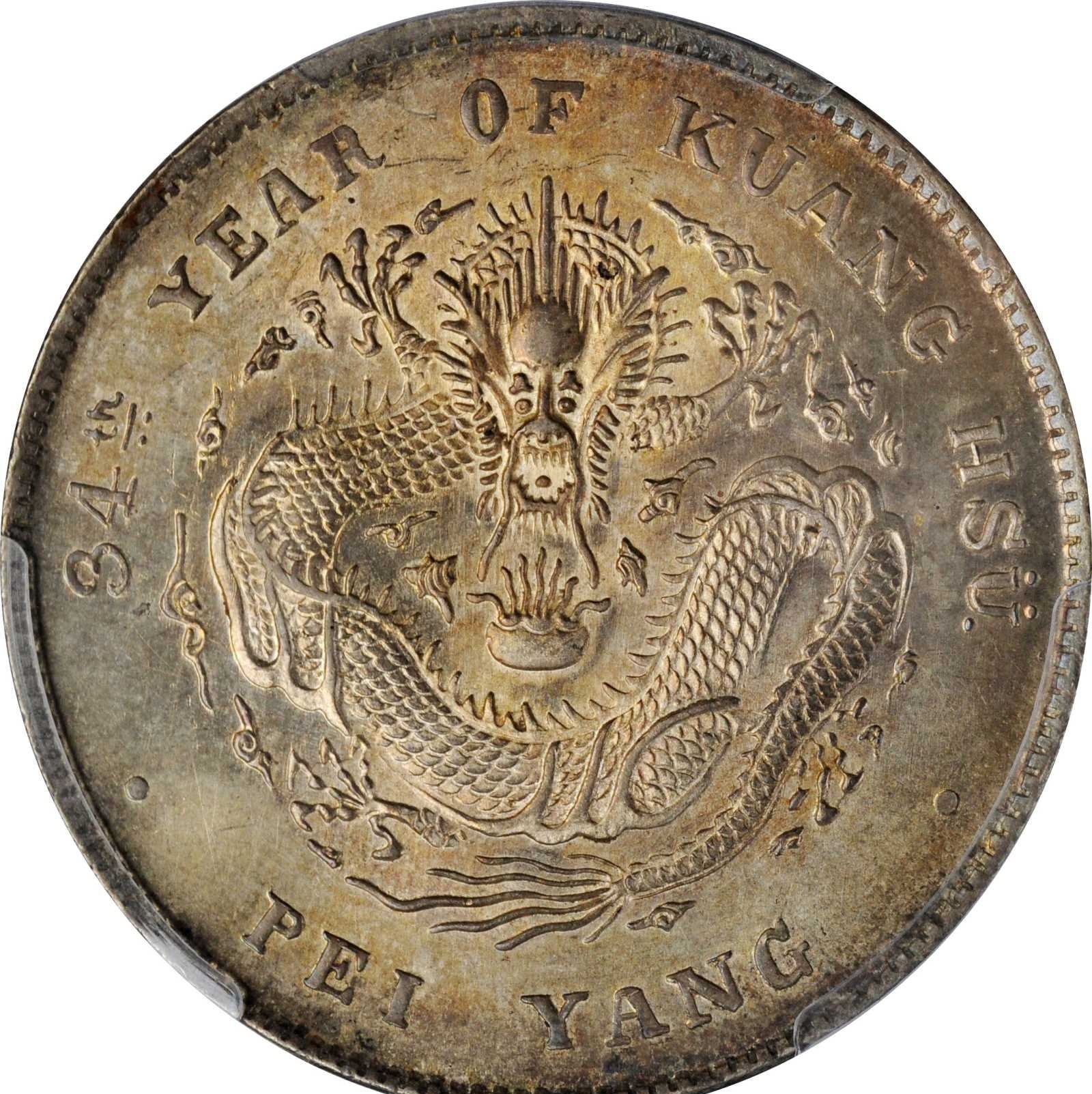 2:北洋造光绪34年七钱二分普通 PCGS MS 64+,估价: RMB 50000 ,成交价格: RMB 195500,拍卖公司:安徽邓通,拍卖专场:安徽邓通2021年春拍-钱币专场,成交时间: 2021-04-12 18:00:00。