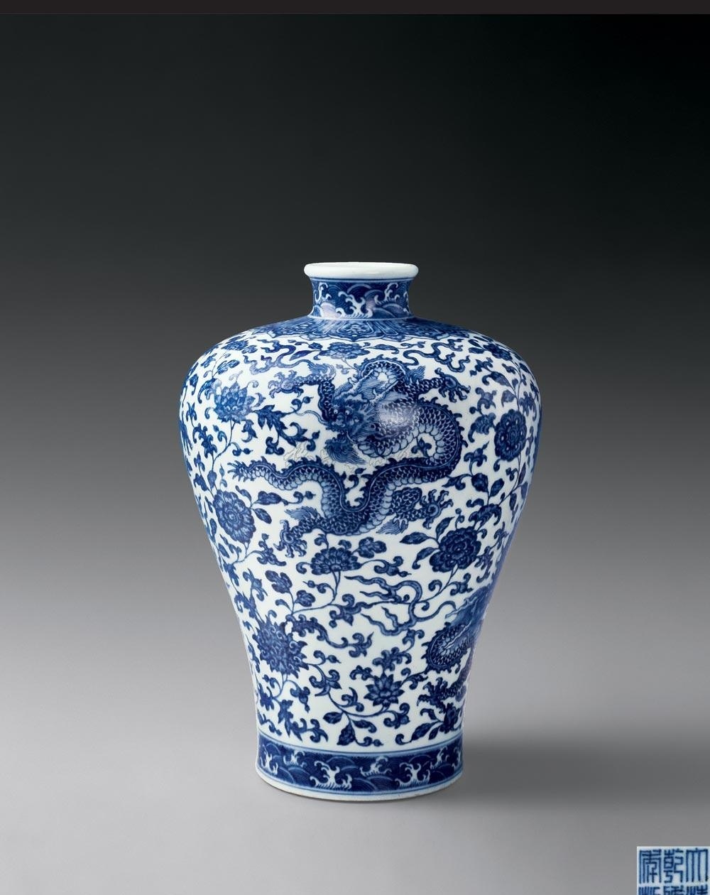 钤印款识:“大清乾隆年制”六字三行篆书款,乾隆本朝。瓶口微撇,短颈,丰肩,长圆腹下敛,圈足。器形规整,工艺甚精,底书乾隆标准官窑款。饰繁密的青花图案,颈及近底处绘海水纹,肩绘莲瓣纹,腹部绘龙穿缠枝花,体现出乾隆朝纹饰布局特点。