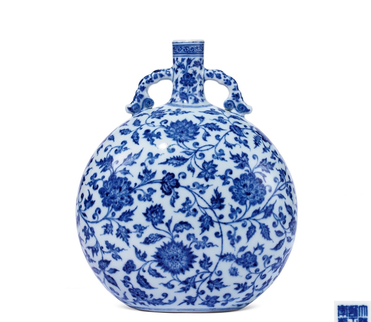 钤印款识:「大清雍正年制」六字三行篆书款。本品直口,短颈,颈侧对称饰双如意云头形耳,扁腹,卧足。通体以青花绘制纹饰,口沿饰卷草纹一周,颈部绘折枝花卉,其余部分满饰缠枝莲、菊、牡丹等四季花卉,笔法精湛细腻,布局繁密适当,青花发色鲜艳耀目。底落「大清雍正年制」六字三行篆书款,工整典雅,颇具气韵。