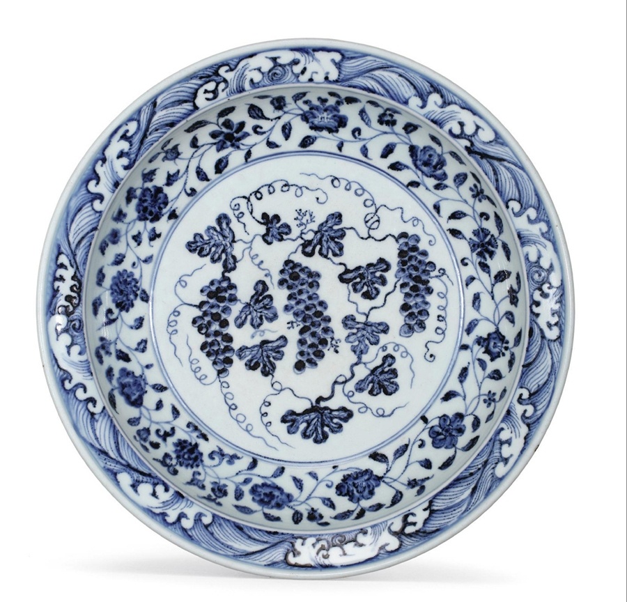 本品即为此中之佳例,其形宏硕端庄,胎质细腻洁白,釉汁莹润亮青,口沿绘一周海水浪涛纹,内外壁均饰十二朵缠枝花卉,勾画婉转流畅,盘心主题纹饰为折枝葡萄图,所绘葡萄,藤蔓绵绵,硕果累累,细须缠绕,枝叶翻卷,布局疏朗而饱满,花果纹饰写实传神,充分借鉴中国水墨画的笔墨意韵,得其法度,勾、勒、点、染诸法,运用皆宜。线条粗细并用,青料浓淡兼施,从而令画面富具苍翠欲滴的意趣,透出凝重雄浑之美,一如朱明盛世,威加四海之气势。青花料聚集处呈铁锈斑,有凹凸不平之感,在釉面映衬下产生清晰明丽之感,苏麻离青料深入胎骨,极具三维效果。永宣时期中外往来密切,瓷器在发达的对外贸易中占有重要的地位,窑业技术精进,规制宏伟。永乐青花折枝葡萄纹大盘亦是当时重要的赏赉用瓷之一,制作精美高超,本品为同类中的上佳之品。