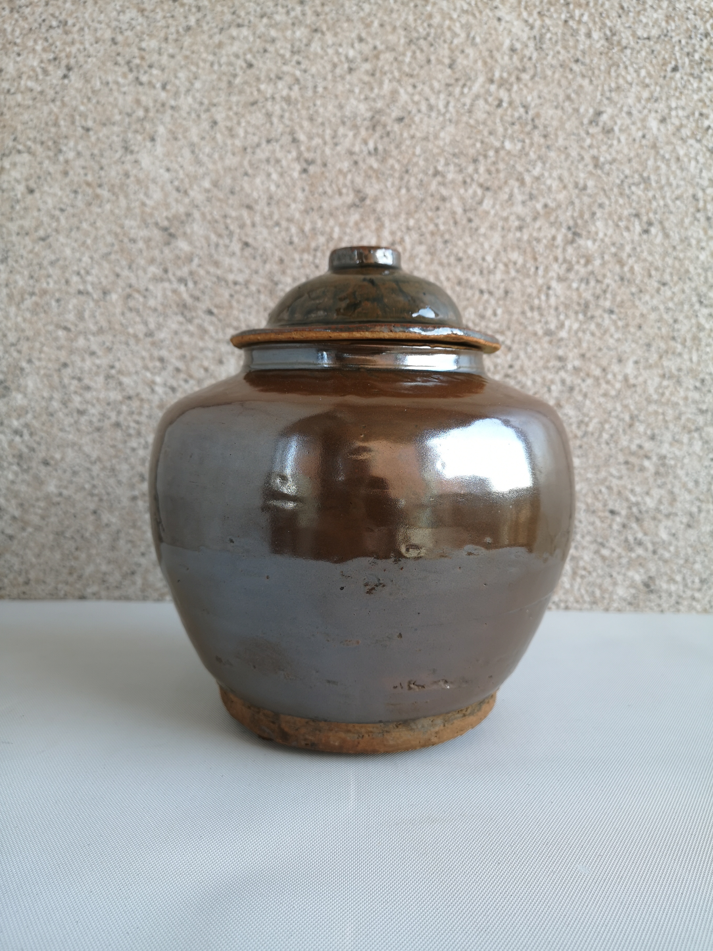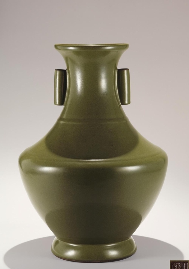 钤印款识:“大清乾隆年制”款。本品是乾隆朝茶叶末一色造型最宏伟者,造型敦实大气,线条起伏婉转,颈部装饰双贯耳,古意悠然,并饰有凸起弦纹一道。通体敷施茶叶末釉,色泽苍雅静穆,光泽厚润柔和,圈足露胎处为黑褐色,以摹“铁足”之效果。底款为阴刻“大清乾隆年制”篆书,为唐英榷陶时期之特有写法,故知此器乃为唐窑之名作,风格古朴清丽,耐人寻味。