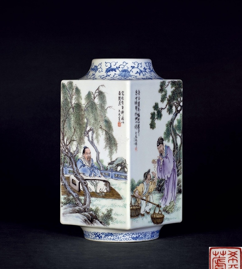 这件粉彩琮式瓶,既目前已知“珠山八友”之一的王大凡粉彩人物创作立件器物之最,造型古朴,秀雅,修沿工整,胎体坚致,细密,釉水肥厚滋润,平匀光洁,浑身酥光莹莹,玉质感极强,一经上手,久久抚摸,不忍释手。其物短颈,四方长方形腹,圆形圈足,瓶口及瓶底外绘蓝料边饰。形制规整,器身四面分别粉彩绘诗意人物故事,画工精美、自然,色彩浓淡相宜,美不胜收。底款落款:希平草庐,篆书,字体规整,雅洁大气。