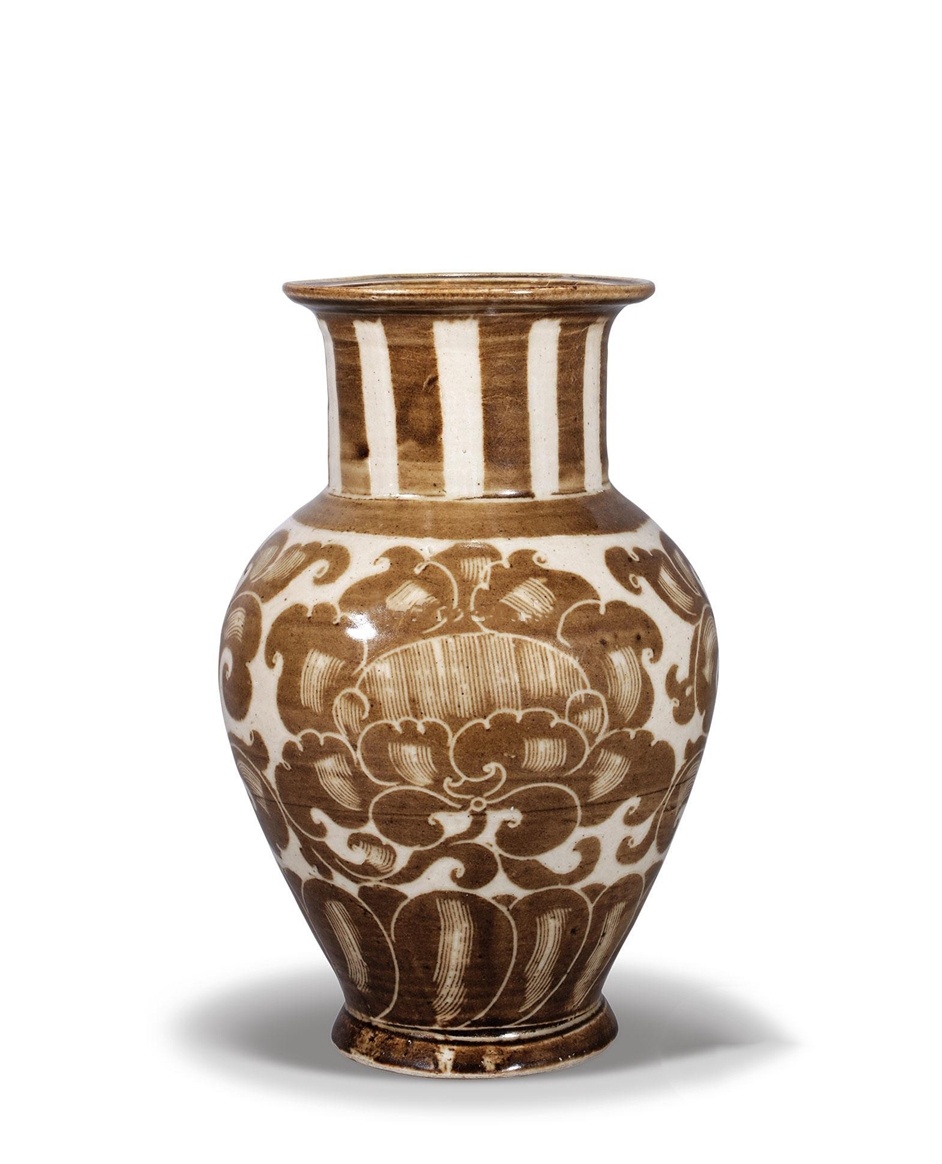其烧制工艺巧妙,首先于白色胎体上施褐色化妆土,在化妆土上勾勒出花纹轮廓,再在花纹内划茎叶等细节,最后将花纹以外的化妆土剔掉,利用深色化妆土与白色胎体之间的反差来突出纹饰,形成鲜活对比,展现花纹之灵动。剔花技法以磁州窑系产品使用最多,但其胎釉及工艺不如定窑精致考究。定窑剔花器物十分罕见,其中以枕类器物稍多,也仅寥寥数例。而剔花梅瓶则未见,同类磁州窑制梅瓶有一件与本品十分相似,于2004年春季经香港佳士得拍卖,成交价高达一千三百五十余万港币,而本件定窑梅瓶品质更胜,胎釉工艺比之更精,传世更为罕见,收藏价值极高。