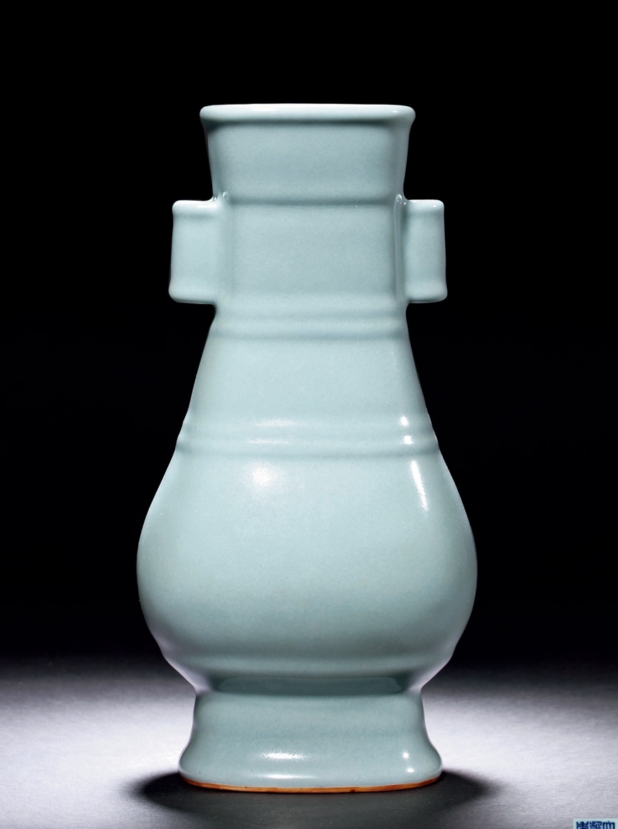 9:清雍正仿汝釉贯耳方壶,尺寸:高26.9厘米,估价:HKD 2,600,000 ~ 3,600,000,成交价: HKD 5,900,000 ,成交时间: 2017-10-02 ,拍卖公司:保利香港拍卖有限公司,拍卖专场:保利香港2017年秋季拍卖会。