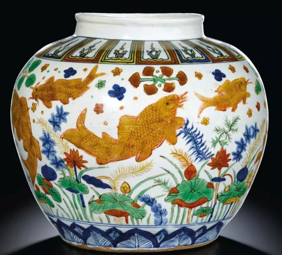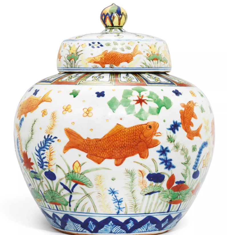 图1:明嘉靖 五彩鱼藻纹盖罐;成交价:RMB 181,986,350;尺寸:高46厘米;拍卖公司:佳士得香港有限公司;成交时间:2017-11-27。