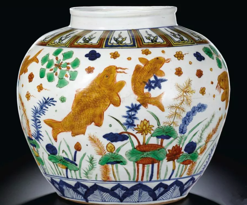 图2:明嘉靖 五彩「荷塘鱼藻」纹罐;成交价:RMB 20,755,760;尺寸:直径40.5厘米;拍卖公司:香港蘇富比拍卖有限公司;成交时间:2013-04-08。