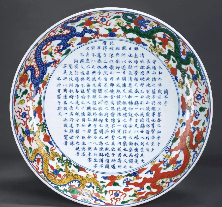 图3:明 明嘉靖 青花五彩云龙纹《兰亭序》诗文大盘;成交价:RMB 12,000,000;尺寸:高10厘米;底足40.5厘米;口径60厘米;拍卖公司:大维德(北京)国际拍卖有限公司;成交时间:2016-12-31。