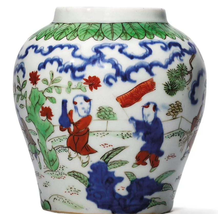 图4: 明嘉靖 五彩婴戏图罐 ;成交价:RMB 3,761,420;尺寸:高14厘米;拍卖公司:佳士得香港有限公司;成交时间:2017-11-27。