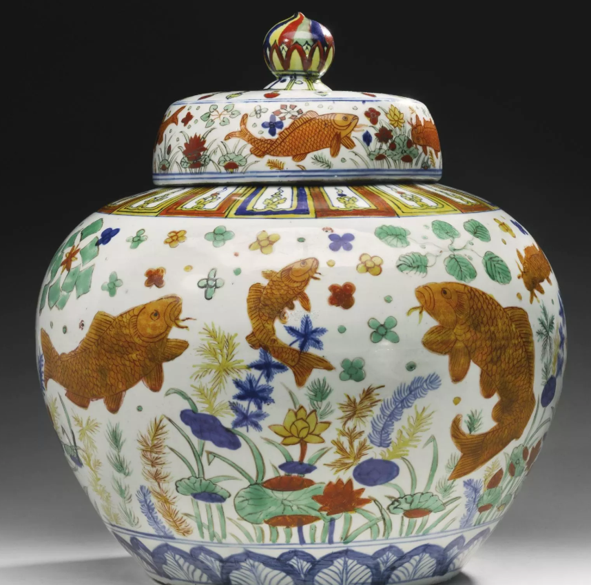 图7:明嘉靖 五彩鱼藻图盖罐;成交价:RMB 12,604,343;尺寸:高40.8厘米;拍卖公司:纽约蘇富比有限公司;成交时间:2012-09-11。