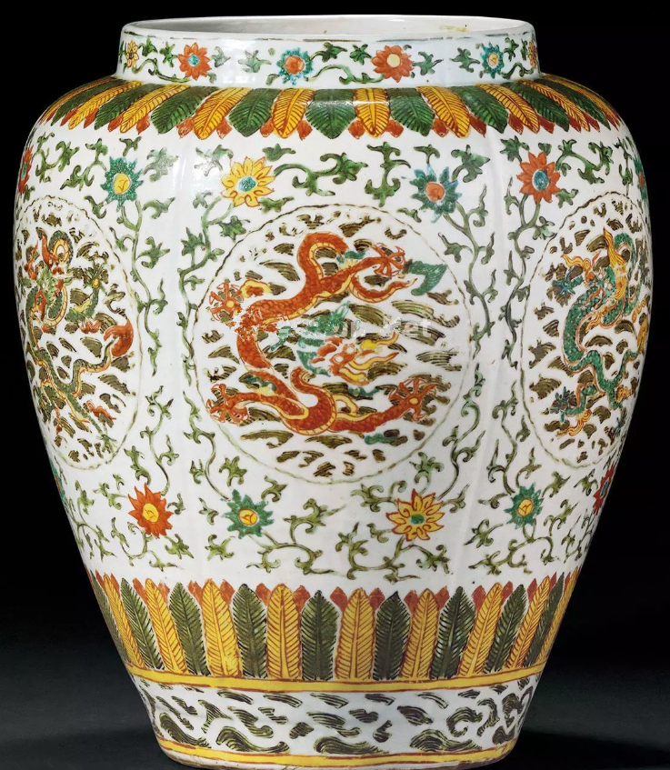 图8:明嘉靖 五彩开光团龙纹大罐 ;成交价:RMB 1,840,000;尺寸:高38.4厘米;拍卖公司:北京诚轩拍卖有限公司;成交时间:2015-11-14。
