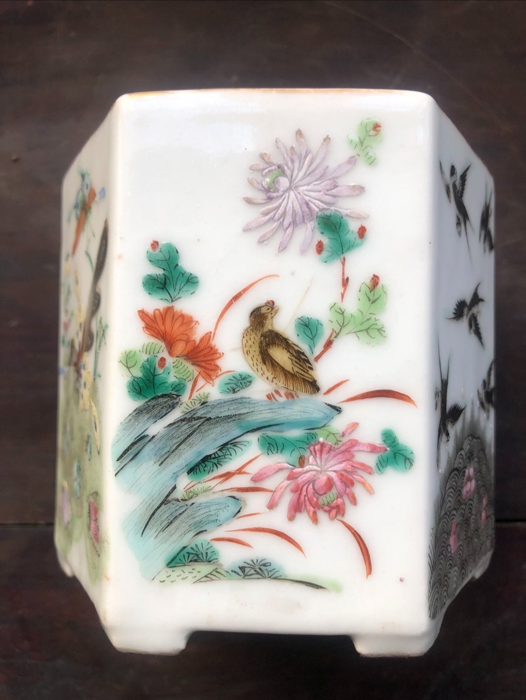 明朝嘉靖年间的五彩瓷器在其纹饰上色彩较为艳丽且浓重,对比感较为的浓烈,深浅不一的姜水黄、松花黄、梨皮黄等,色泽较为的丰富。其五彩瓷器中的瓷器釉色大多都是白中泛青,瓷器的底部施加了非常多的亮色的青釉,甚至有些瓷器的釉面存在着黑褐色的斑点,这种斑点主要是由于色彩以及原料的提纯、上色程序不同,所以会出现黑褐色斑点的现象。