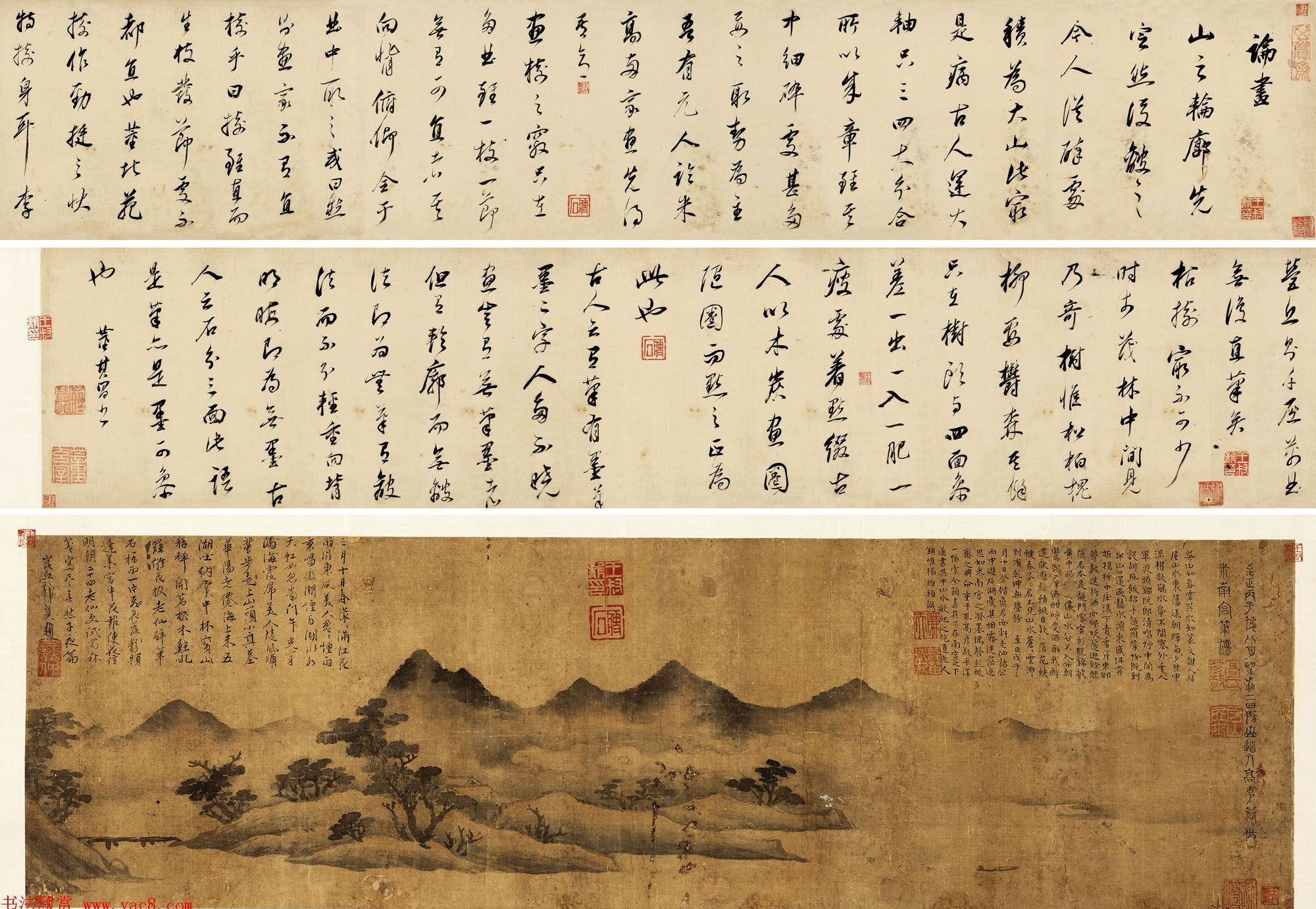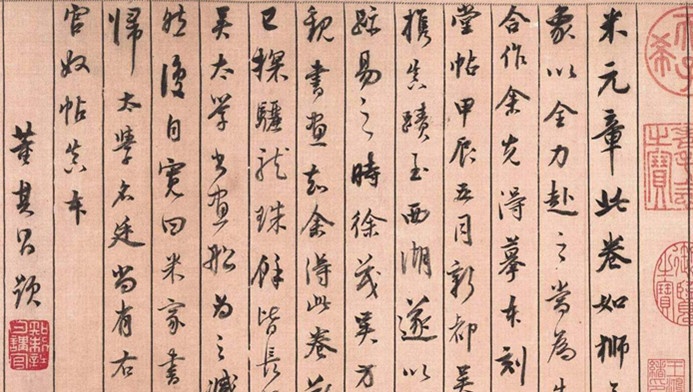 董其昌书法注重在平淡中求变化,行书、楷书、草书相间使用,显得非常自然,在笔画的用墨上时浓时淡,笔墨浓的时候多为大字粗笔,笔墨淡的是则就是小字细笔,使得整篇文章显得特别生动,尽得其妙。