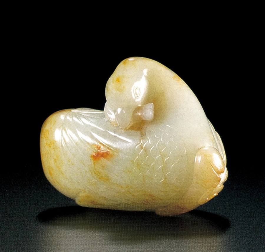 2:14世纪白玉「衔莲宝鸭」,尺寸:8厘米,估价:HKD 150,000 ~ 200,000,成交价: HKD 1,004,000 ,成交时间: 2011-10-05 ,拍卖公司:香港蘇富比拍卖有限公司,拍卖专场:2011年秋季拍卖会。