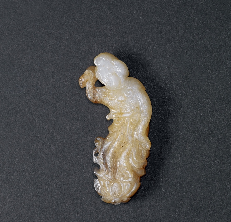 3:唐莲花仕女玉佩,尺寸:高7.1厘米;宽2.9厘米;厚0.9厘米,估价:HKD 120,000 ~ 180,000,成交价: HKD 1,003,000 ,成交时间: 2020-10-10 ,拍卖公司:中国嘉德国际拍卖有限公司,拍卖专场:中国嘉德香港2020秋季拍卖。