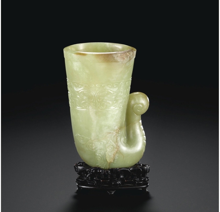 5:清十七/十八世纪黄玉仿古「饕餮」纹觥,尺寸:13.1厘米,估价:HKD 900,000 ~ 1,500,000,成交价: HKD 1,000,000 ,成交时间: 2013-10-08 ,拍卖公司:香港蘇富比拍卖有限公司,拍卖专场:2013年秋季拍卖会。