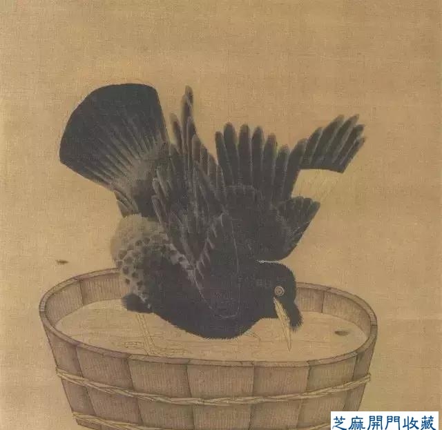 一只八哥于盆中扑翅,南宋画家李迪以勾线墨染手法,让主体形象(“八哥”)以大面积浓重墨色完全占据了画面的视觉中心,这种不同寻常带有渲泄意味的构图方式对传统审美视觉习惯颇具挑战性。