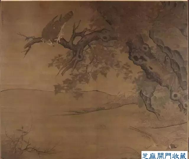 图绘崖石边一株老树,枫叶繁茂,老干斜置。树下是平缓堤坡,其上棘荆丛生。一场强与弱、生与死的拼斗就是在这个背景中展开的。枯枝上的苍鹰双爪紧抓树枝,俯身欲扑树下惊慌逃窜的锦雉;锦雉被吓得毛羽倒竖,伴着阵阵哀鸣,撒开腿拼命逃向草丛。整个画面充满紧张的气氖和雄沉的悲剧色彩。作者不仅通过体态,更是通过眼神表现出鹰与雉的神情。老鹰目光劲利,锦雉则目露惊恐和绝望之色。它们生死存亡的不同命运,通过各自不同的眼神,而惟妙惟肖地展示出来。恰如东晋顾恺之所说: “传神写照,正在阿堵之中。”此图构思上寓动于静,寓激烈于平缓。坡堤、野草、枫树、怪石都呈安静之态。可是,老鹰意欲下捕的身姿和慌忙夺路的锦雉却打破了这种平静的情景,而使画面顿生跌宕。在画面处理上,于左面留下一片阔大的空间,它使人联想起锦雉奔逃的轨迹。在笔墨表现上,枫树树干勾勒粗犷,运笔顿挫有力,施墨凝重浑厚,表现出树干苍健劲老之感。树叶、竹叶、草均以细线双勾,然后晕染,通过墨色浓淡的变化,表现枝叶向背和远近层次。鹰、雉造型生动准确,注重表现鸟羽的光泽感和柔软蓬松的质感。北宋后期以来,在画院的绘画中,册页小品日渐盛行,像《枫鹰雉鸡图》这样的巨幅大画,则十分罕见。