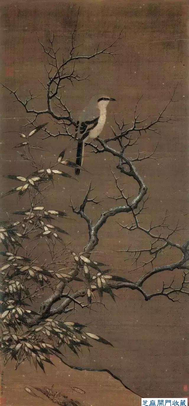 此图写竹叶覆雪,轻染薄雪的棘树上,栖息着一只伯劳。山坡以粗笔勾出,写一丛衰草,更添雪意。双钩写竹、树干,敷色渲染。雀鸟以没骨及钩勒相结合绘出,写实生动。是作者晚年的精心之作。