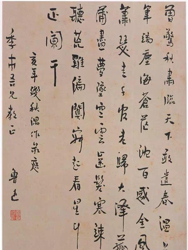 同样最为文学家和书法家的郭沫若评价鲁迅的书法说:融冶篆隶于一炉,听任心腕之交应,质朴而不拘挛,洒脱而有法度,远遂宋唐。直攀魏晋。世人宝之,非因人而贵也。