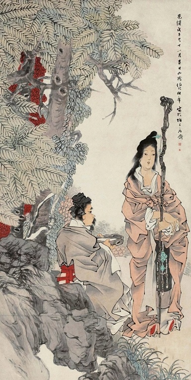 天仙赐福 立轴 设色纸本, 拍卖成交价格估计:RMB 3,000,000-4,000,000,最终成交价格:RMB 4,485,000, 拍卖专场:中国嘉德国际拍卖有限公司 中国嘉德2012春季拍卖会, 拍卖成交时间:2012-05-14, 尺寸:245×120cm。