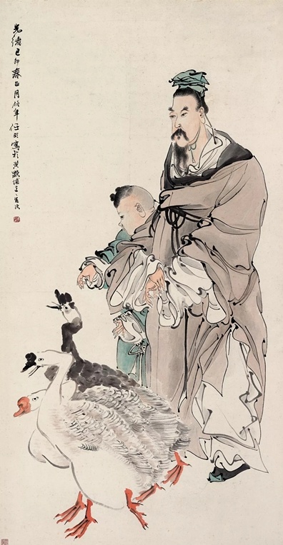 羲之爱鹅图 立轴 设色纸本, 拍卖成交价格估计:RMB 2,000,000-4,000,000,最终成交价格:RMB 3,795,000, 拍卖专场:中国嘉德国际拍卖有限公司 中国嘉德2017秋季拍卖会, 拍卖成交时间:2017-12-18, 尺寸:130×64.5cm。