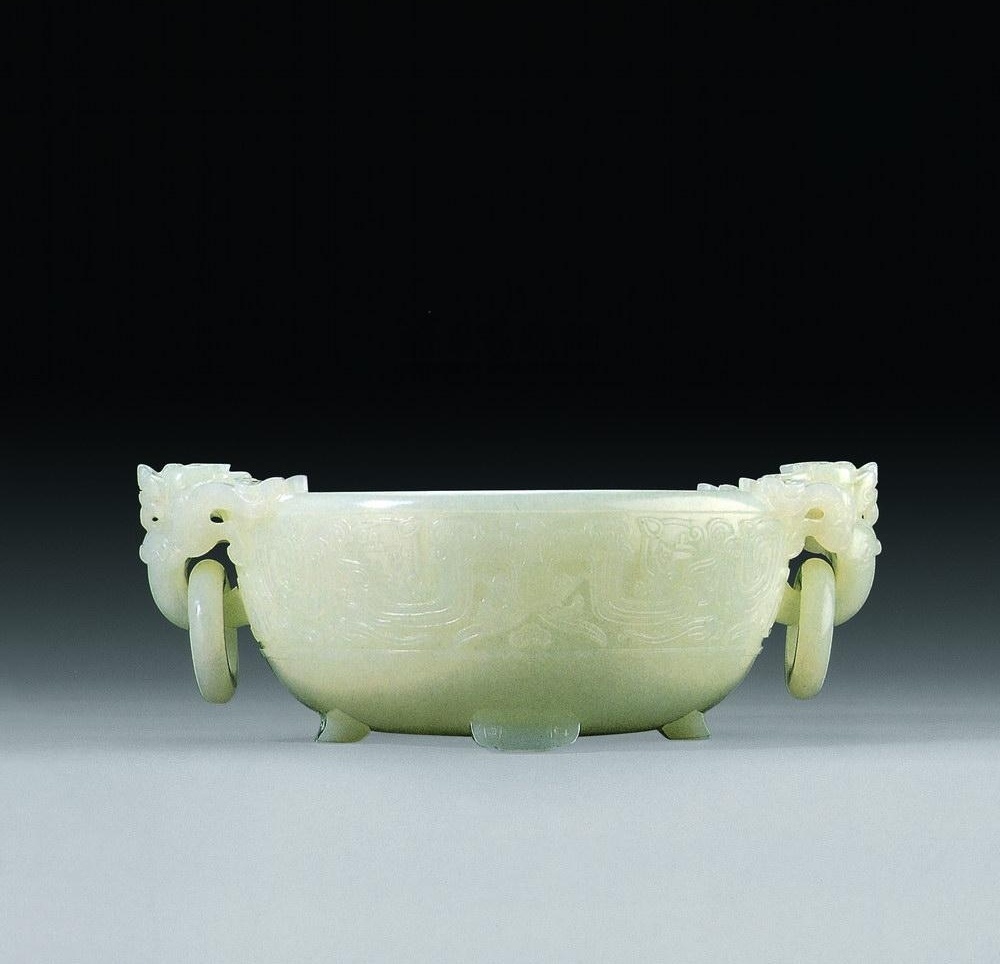 1:清乾隆白玉雕夔龙纹活环龙首耳碗,尺寸:20.6厘米,估价:HKD 1,000,000 ~ 1,500,000,成交价: HKD 1,035,000 ,成交时间: 2001-04-29 ,拍卖公司:佳士得香港有限公司,拍卖专场:2001春季拍卖会。