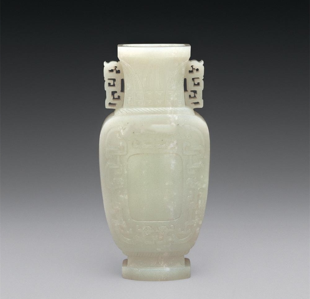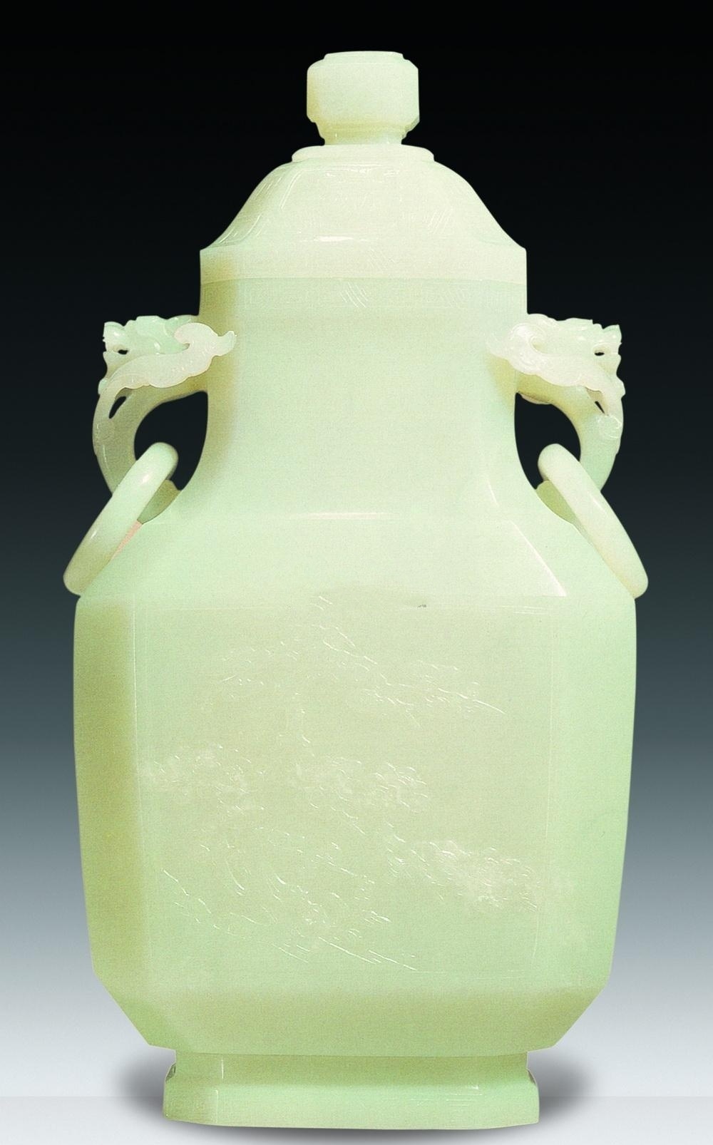 2:清乾隆白玉雕开光式花石图螭龙耳活环方瓶,尺寸:24.6厘米,估价:HKD 900,000 ~ 1,200,000,成交价: HKD 1,034,750 ,成交时间: 2001-05-01 ,拍卖公司:香港蘇富比拍卖有限公司,拍卖专场:2001春季拍卖会。