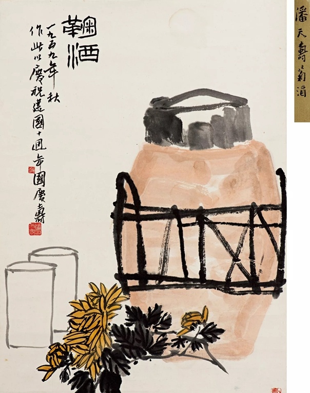 1959年作 菊酒 立轴 设色纸本, 拍卖成交价格估计:HKD 1,500,000-2,000,000,最终成交价格:RMB 4,015,540, 拍卖专场:中国嘉德国际拍卖有限公司 中国嘉德香港2017秋季五周年庆典拍卖会, 拍卖成交时间:2017-10-02, 尺寸:65×45.5cm。