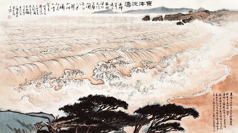 东海波涛 镜心 设色纸本, 拍卖成交价格估计:RMB 3,800,000-5,000,000,最终成交价格:RMB 4,370,000, 拍卖专场:北京都市联盟国际拍卖有限公司 2013年春季拍卖会, 拍卖成交时间:2013-06-17, 尺寸:157×253.5cm。