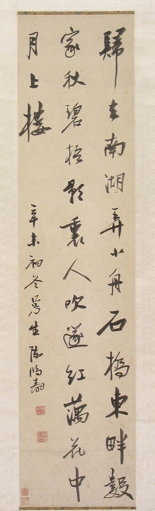 清陈鸿寿行书诗轴,现藏于故宫博物馆。此书轴作于清嘉庆十六年(1811),洒金宣纸。行书三行,写书七绝一首,其诗为“归去南湖弄小舟,石桥东畔数家秋。碧梧影里人吹笛,红藕花中月山楼。”下署款“辛未初冬,曼生陈鸿寿”,款下钤白文印二方“陈鸿寿印”、“洮湖长”。右下角钤“桐城素培金石书画印”、“泽公孙藏”二方收藏印。