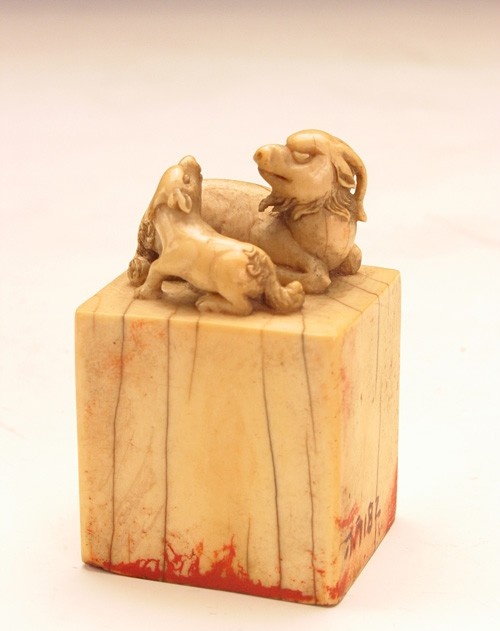 该印为一对,两印均一样雕刻题材。此印用象牙制成,印钮为圆雕两只羊,一只大羊,一只小羊,小羊头微微转向大羊,头向上仰,小羊后腿蹲,前腿站立,大羊卧于印上,有胡须,角长而下耷,大羊回首状,头部略仰,两羊转首对视,非常亲密。两印下有各有阳文篆书印一方,其印文内容分别为“无不读书神仙”、“有打瞌睡豪杰”。