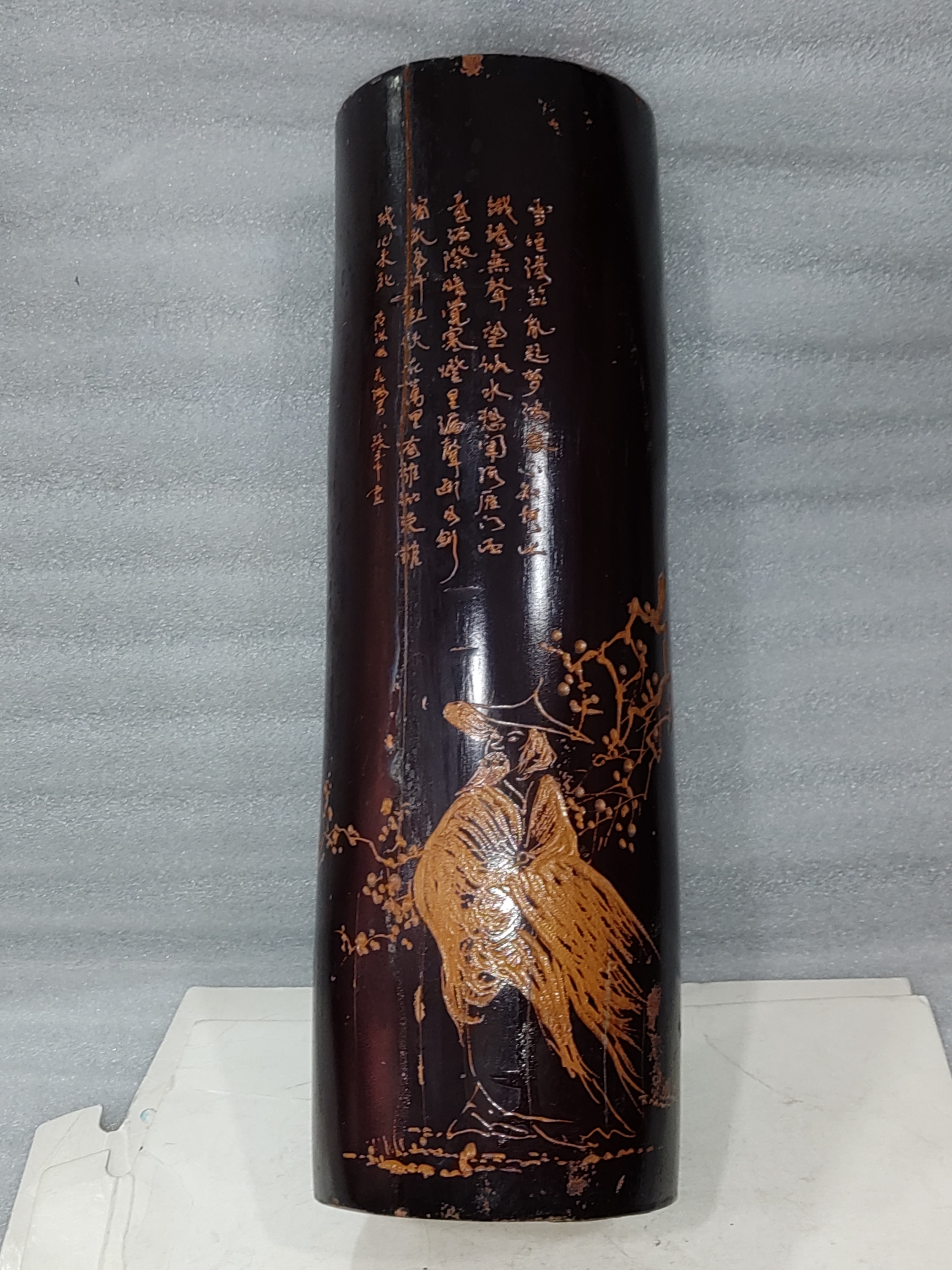 创汇几十年的漆器大竹帽筒,刻画诗词人物非常漂亮!传世包浆痕迹自然开裂正常。包真包老值得拥有!