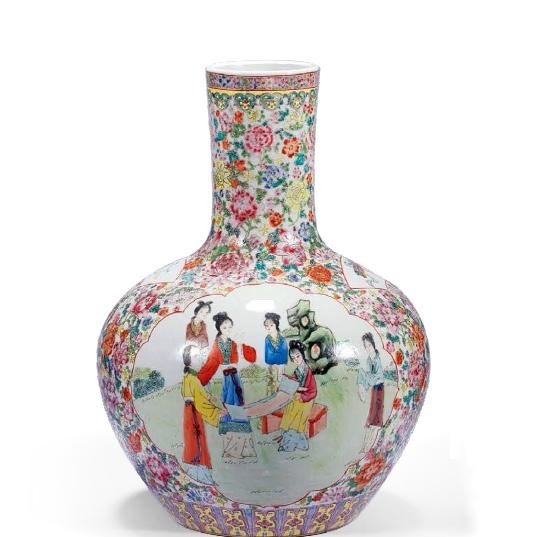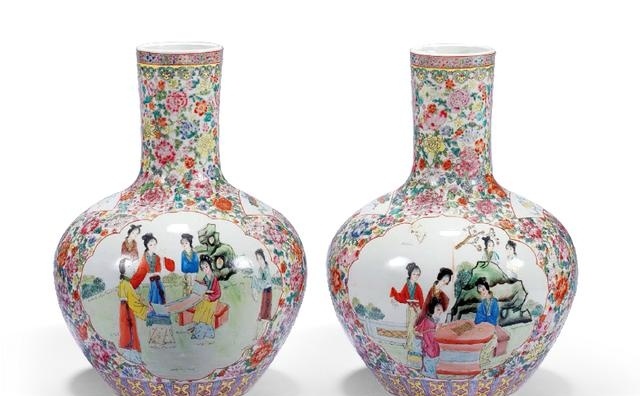 这对天球瓶圆口长颈,鼓腹圈足,采用开光技法进行装饰,内画仕女图,女子各着长裙,梳高髻,神情各异,或在赏画,或在对弈,整个画面极富文人气息,开光之外以百花不落地技法为装饰,即以粉彩在胎体空白处描绘各类花卉,其间不留空隙,这种技法盛行于乾隆时期,此对瓶画面繁冗富丽,极为华美,贵气十足,具有较强的视觉冲击力,极富观赏价值。