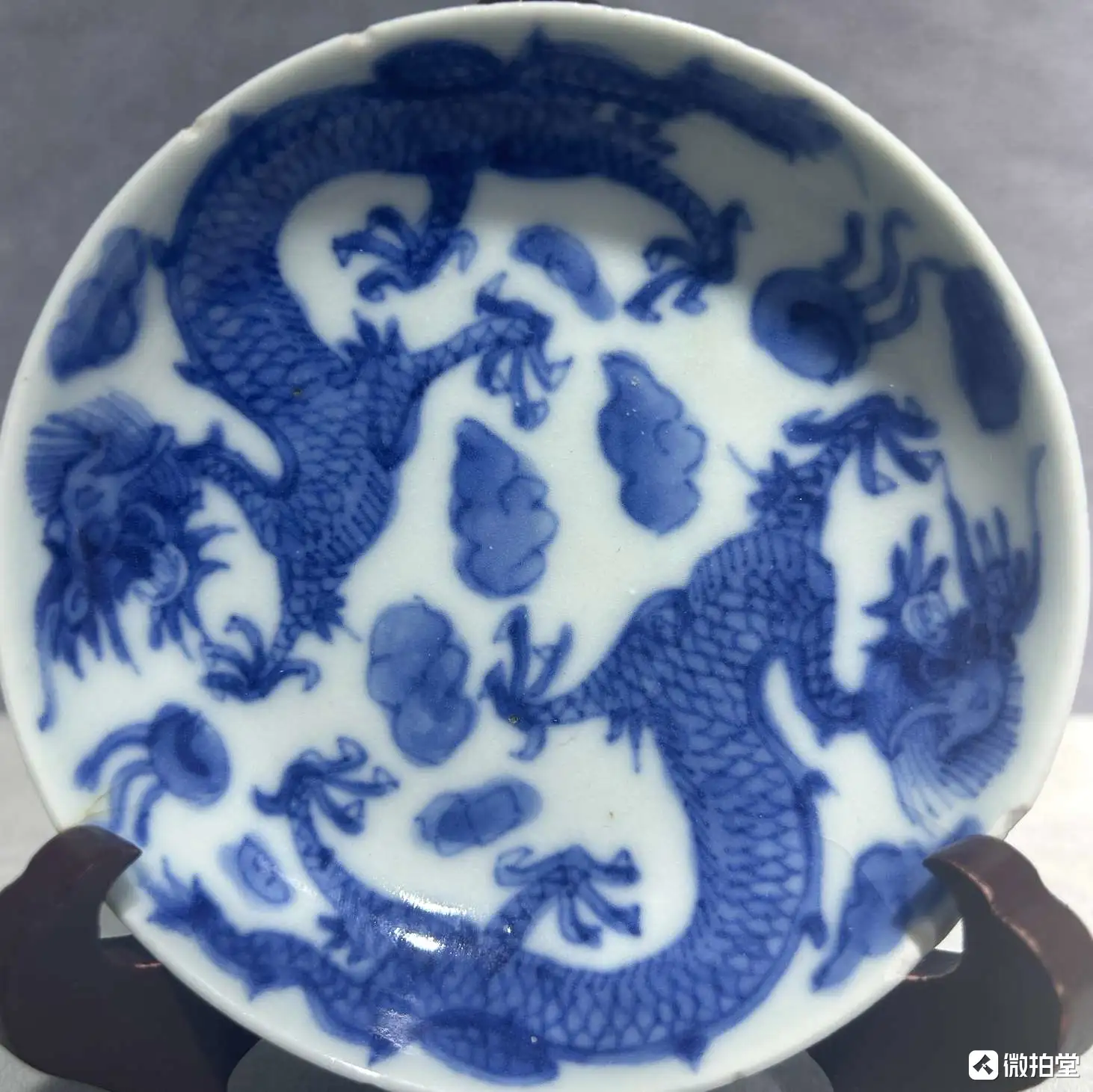 双龙戏珠盘,龙纹路份高,画工 细路,整体线条流畅,笔法细腻 而比例协调!底胎干爽,修足利 落! 本朝款识, “大清嘉庆年制”为 藏品增添价值! 釉面光洁莹润,青花发色鲜艳, 给人以古朴雅致之感! 品相补充:所见即所得,盘沿蚁 蛟,短冲。余全美。 价值收藏,值得入手!