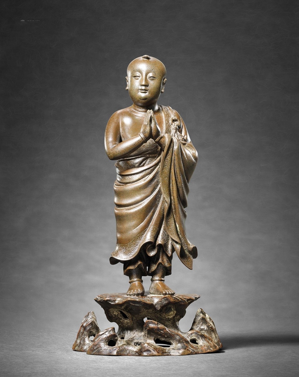1:明十六十七世纪铜错银沙弥立像,尺寸:21.5厘米,估价:HKD 1,400,000 ~ 2,500,000,成交价: HKD 1,720,000 ,成交时间: 2014-04-08 ,拍卖公司:香港蘇富比拍卖有限公司,拍卖专场:2014年春季拍卖会 。