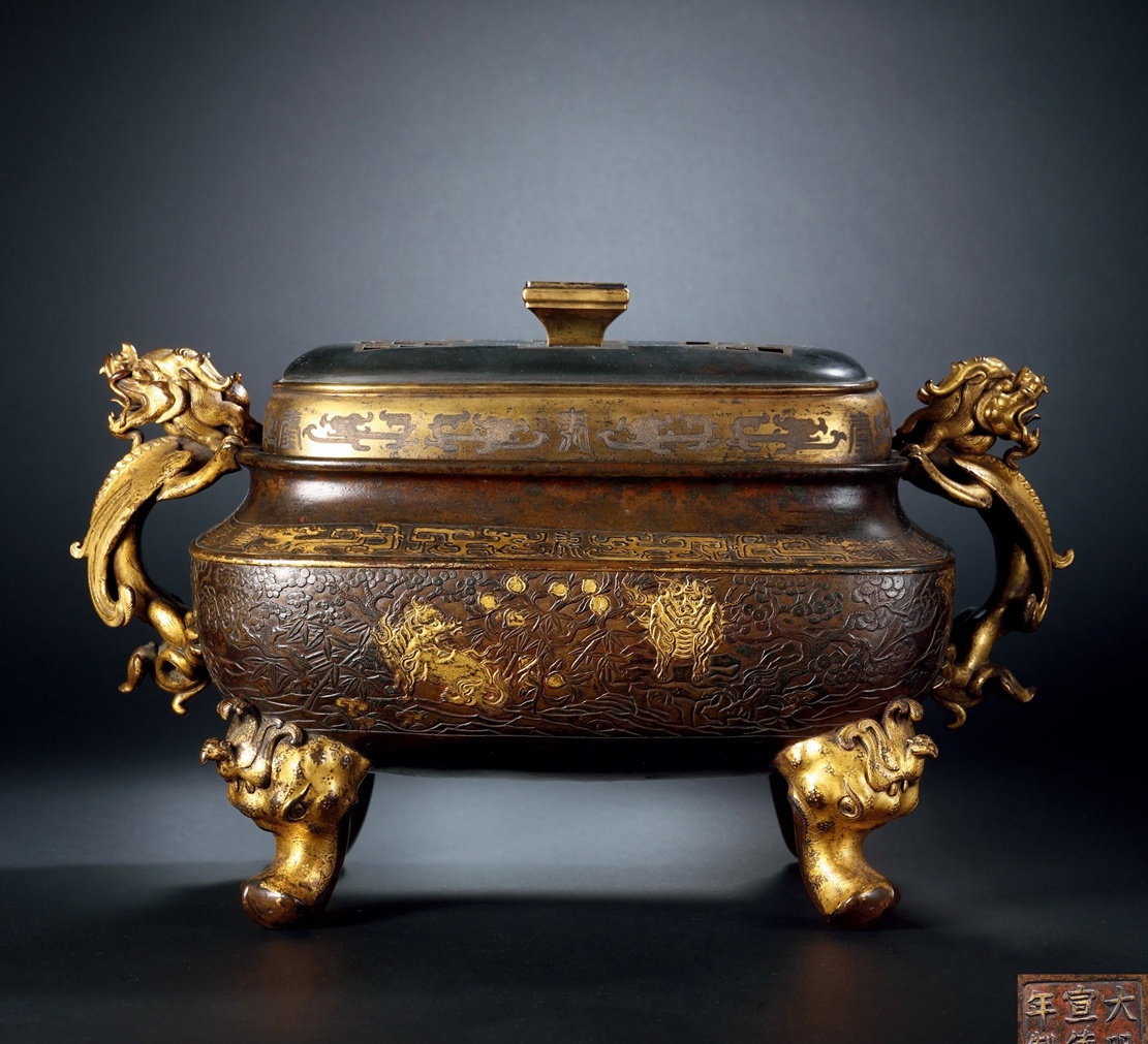 3:明嘉靖-万历铜局部鎏金螭龙耳瑞兽纹熏炉,尺寸:长40.6厘米;宽25厘米;高24.5厘米;重7845g,估价:RMB 1,500,000 ~ 1,800,000,成交价: RMB 1,725,000 ,成交时间: 2021-12-05 ,拍卖公司:北京保利国际拍卖有限公司,拍卖专场:北京保利2021秋季拍卖会。